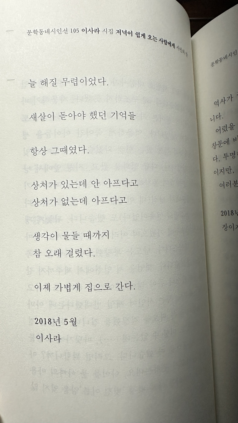 책을 읽다 보면, 마치 시인들과 직접 대화를 나누는 듯한 친밀감이 느껴집니다. 시인의 고백을 통해 시집을 읽기 전 혹은 읽은 후의 감상이 더욱 깊어지고, 시를 쓰는 사람의 내면을 엿볼 수 있는 특별한 경험을 선사합니다. 시인의 말들은 때로는 한 줄의 함축적 문장으로, 때로는 긴 사색의 글로 독자에게 다가옵니다. 그 안에는 아직 쓰지 않은 시에 대한 갈망, 앞으로 써야 할 삶에 대한 다짐, 그리고 시와 독자에 대한 애정이 담겨 있습니다.