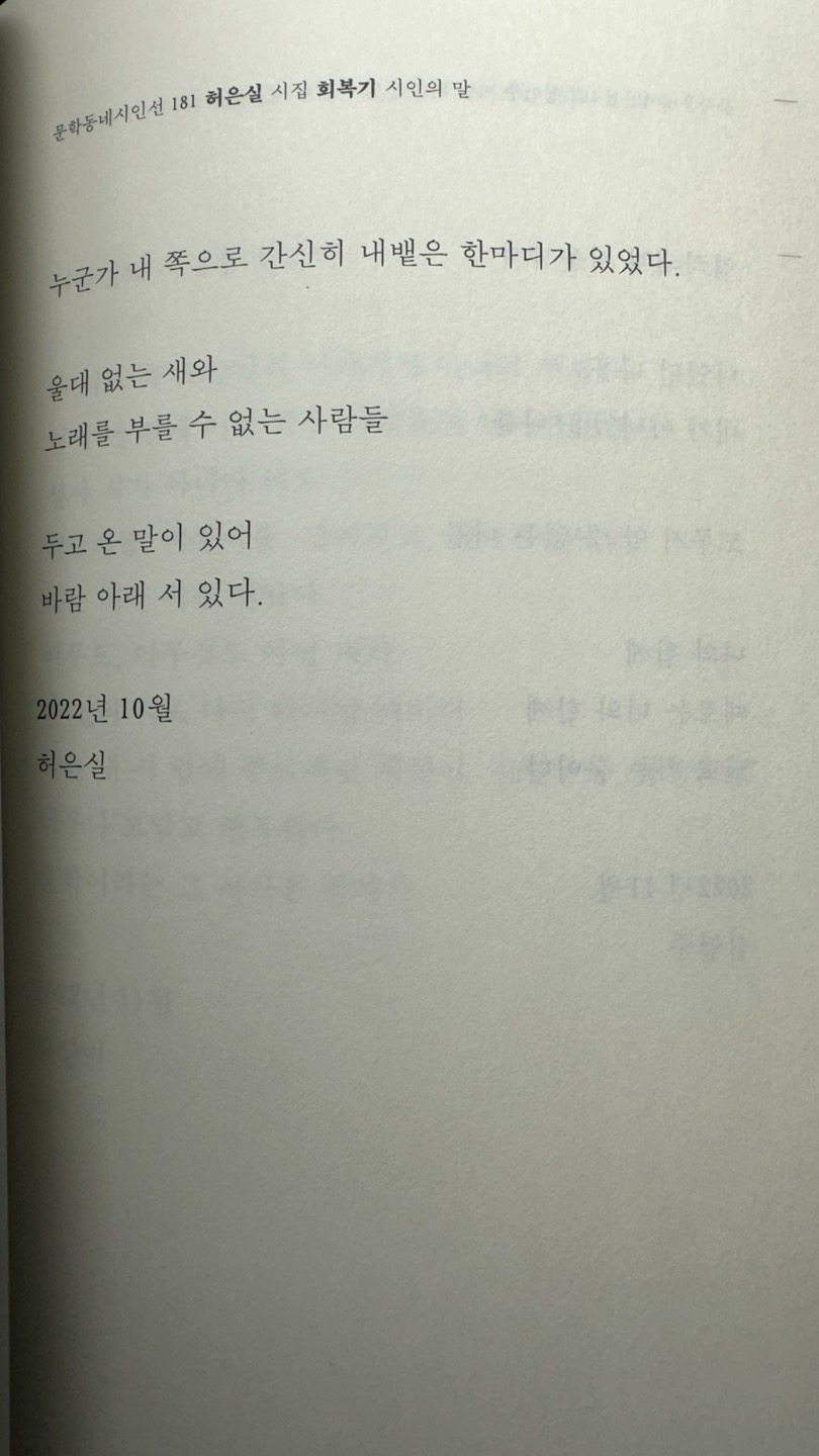 교보문고에서 구매한 3권의 책들중 어제 월든을 소개해드렸는데요, 오늘은 문학동네 시인선 200권 출간을 기념해 한정판으로 출간된 내가 아직 쓰지 않은 것을 소개해드리겠습니다 .이 책은 한국 현대시의 흐름과 시인들의 내밀한 목소리를 한 권에 담아낸 특별한 책으로, 2010년 겨울 최승호 시인의 ‘시인의 말’부터 2023년 한여름 한연희 시인의 ‘시인의 말’까지, 문학동네시인선 001번부터 199번까지 각 시집의 ‘시인의 말’들이 담겨있습니다. ‘시인의 말’은 시집의 맨 마지막 혹은 맨 앞에 실려, 시인과 독자가 처음으로 인사를 나누는 자리이자, 시인이 자신의 시와 삶, 그리고 독자에게 전하고 싶은 진솔한 고백이 담긴 글입니다.